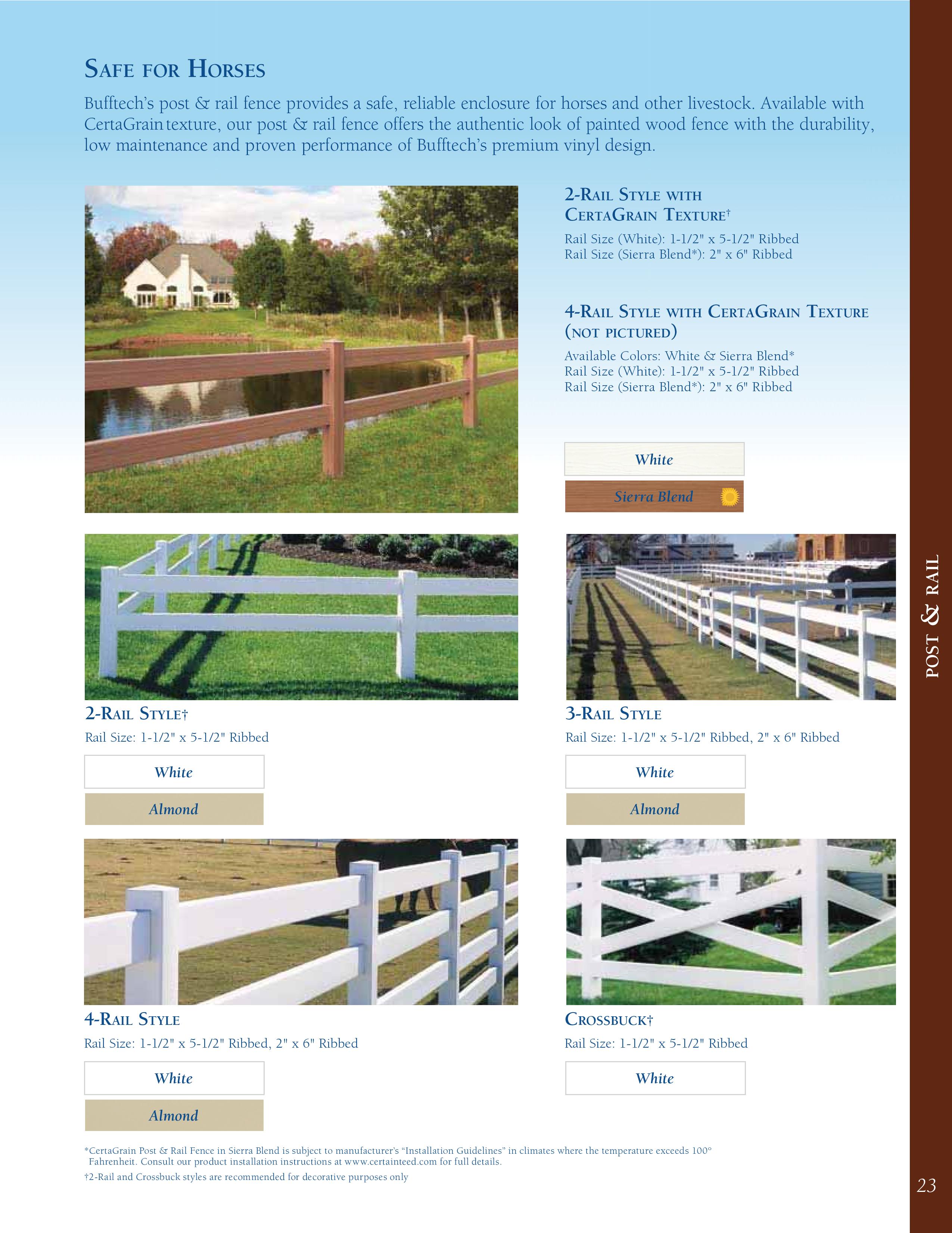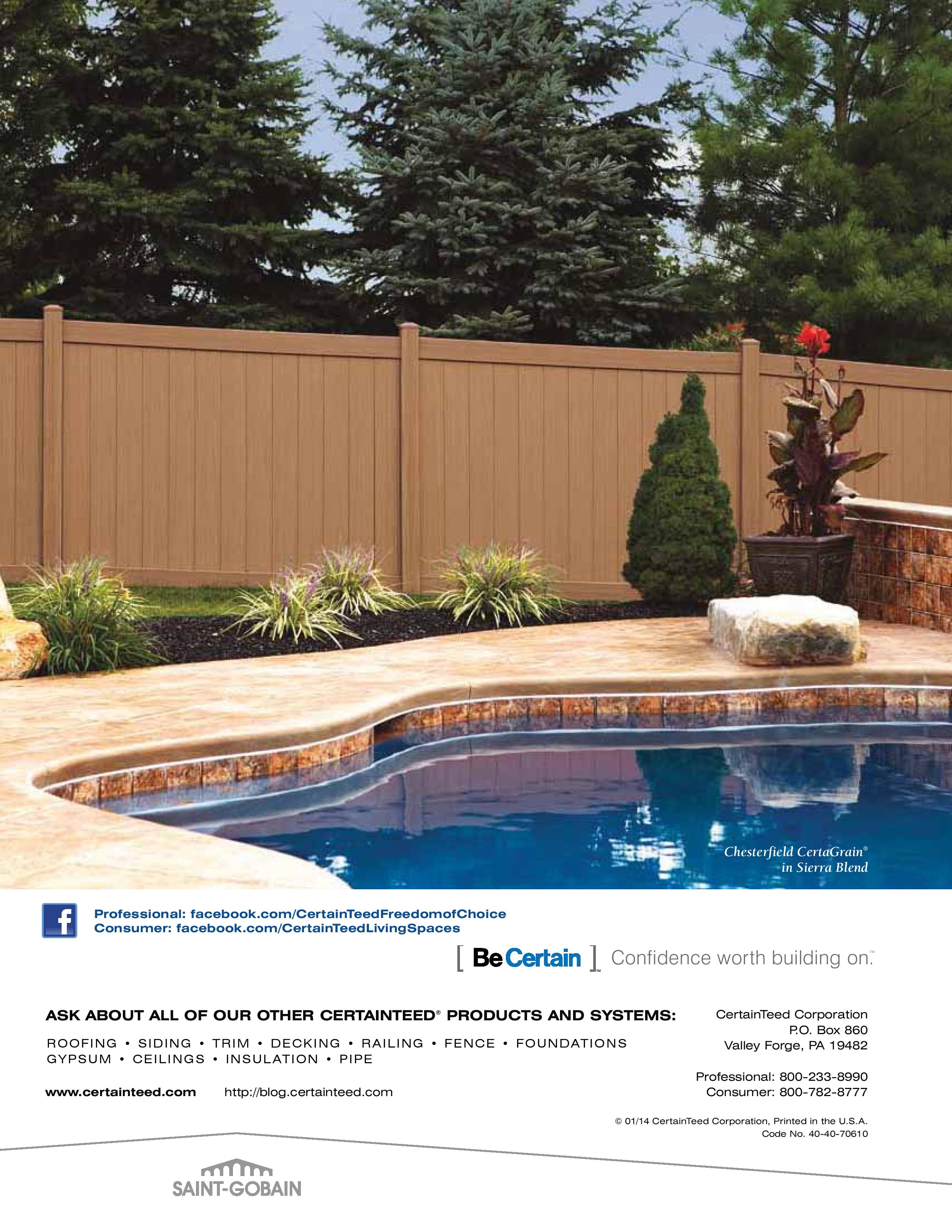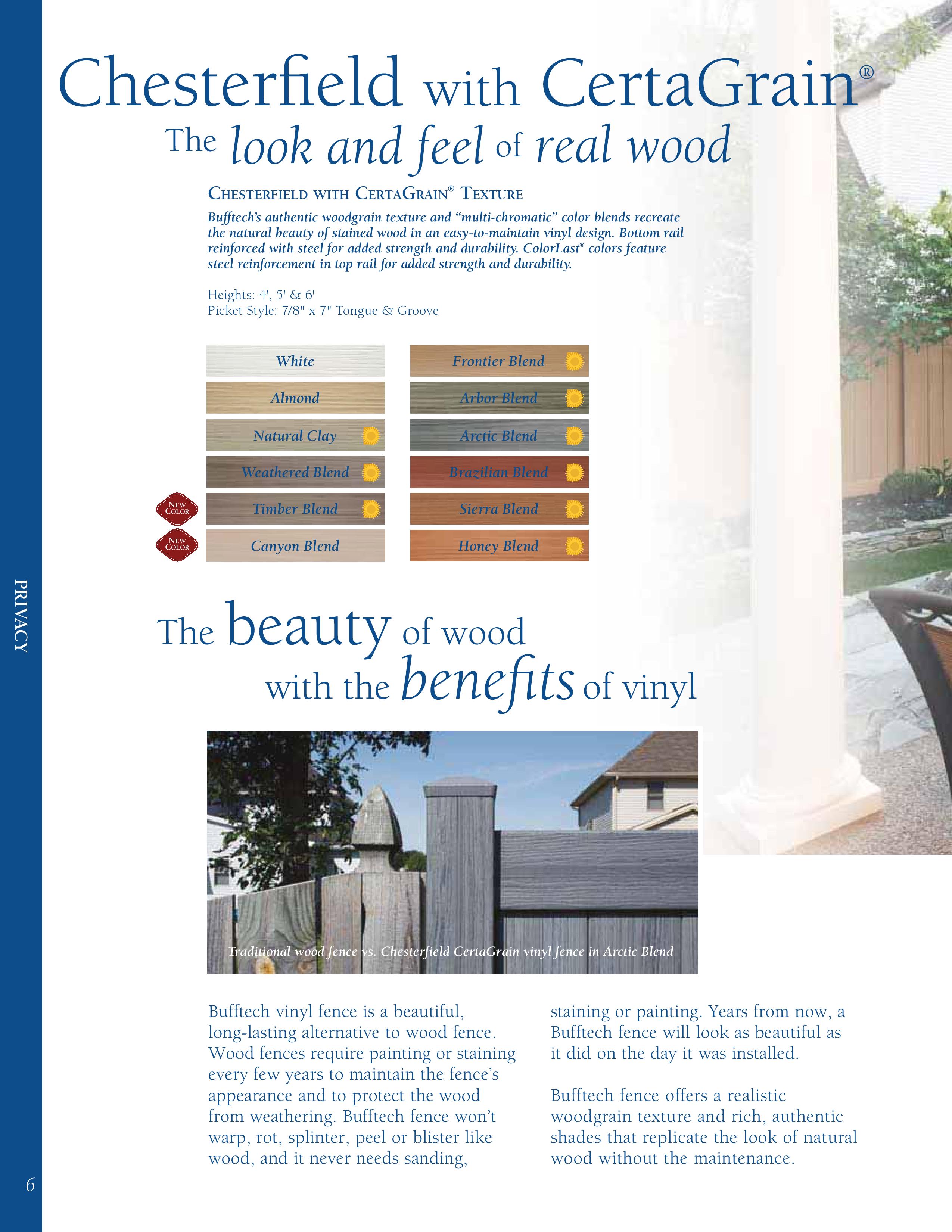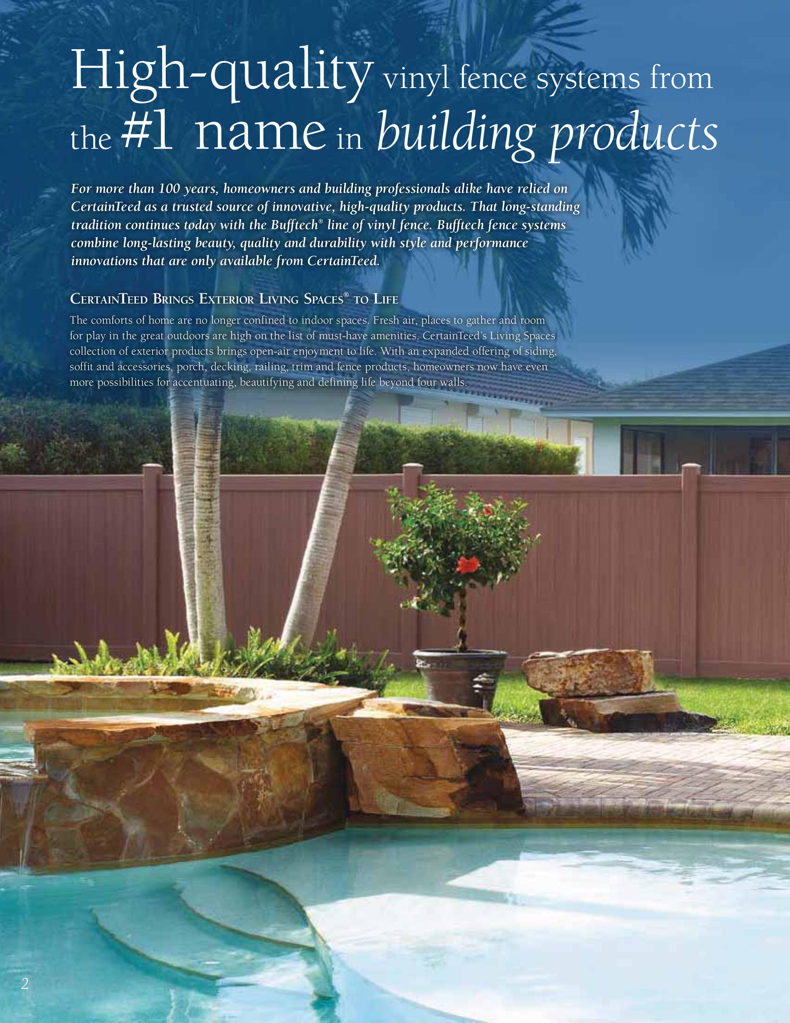 Our Bufftech vinyl fencing is distributed by CertainTeed. Vinyl fencing is very easy to clean and comes in a variety of heights, textures and colors to suit your needs. To see available products, view the brochure below. For more product brochures, visit the CertainTeed website.